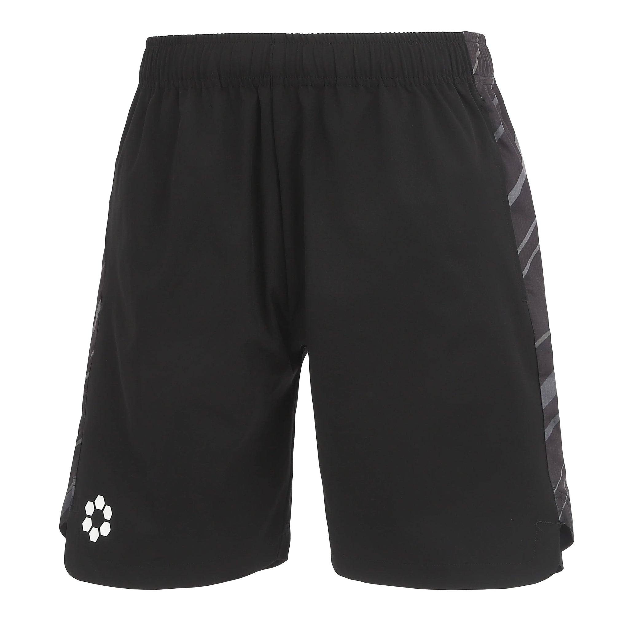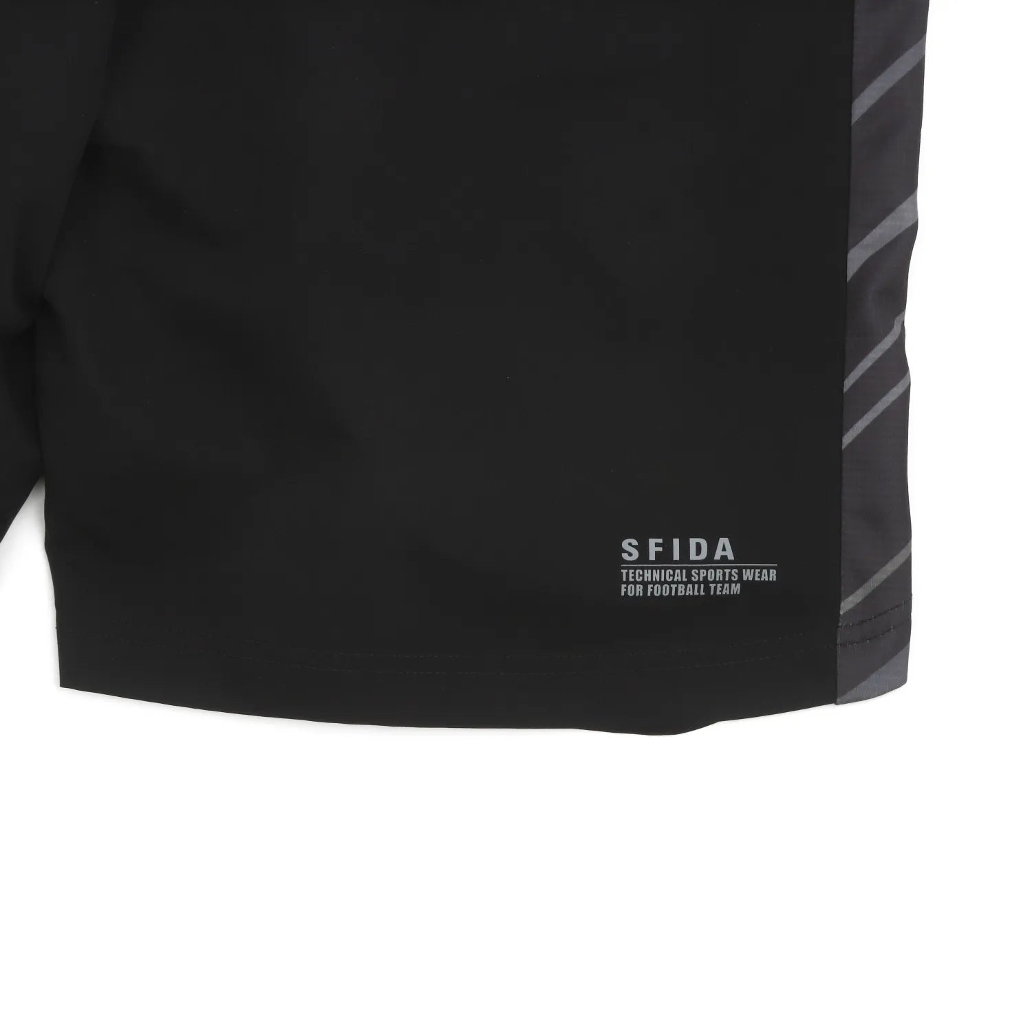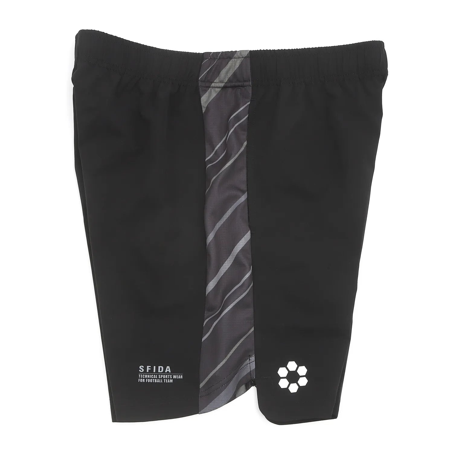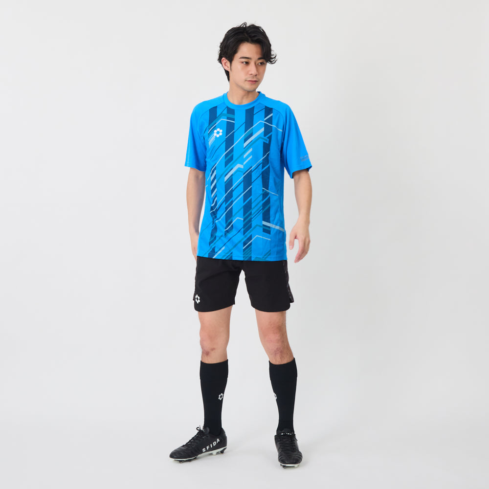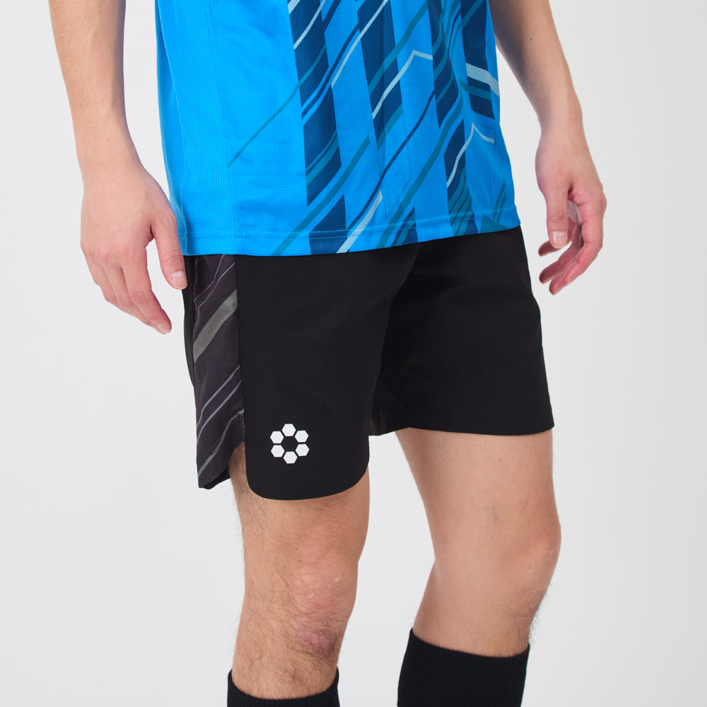 ハリのあるウーブン素材が作る美しいシルエットは、ピッチ上での立ち姿を凛とさせます。サイドに施されたグラフィック入りのニットパネルが、デザインのアクセントです。